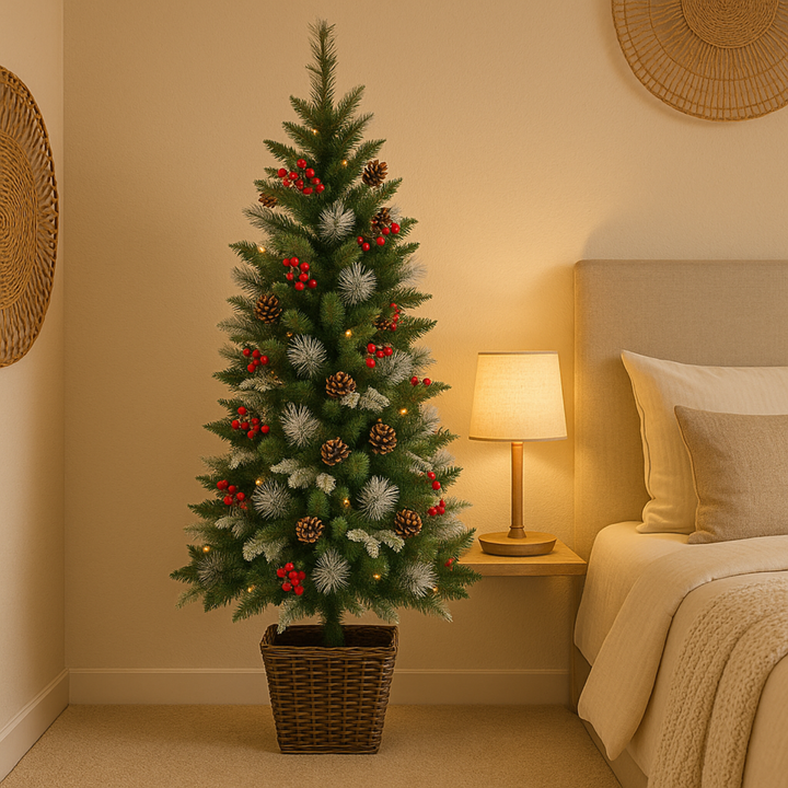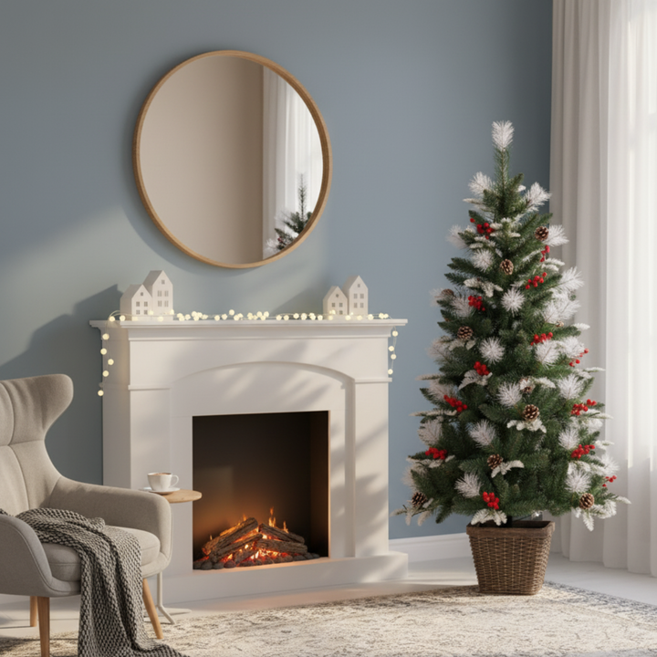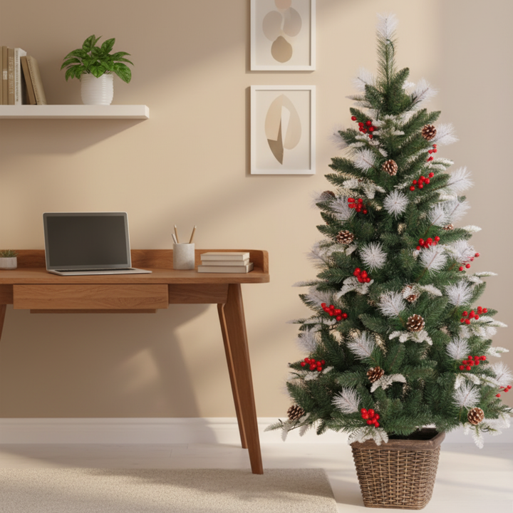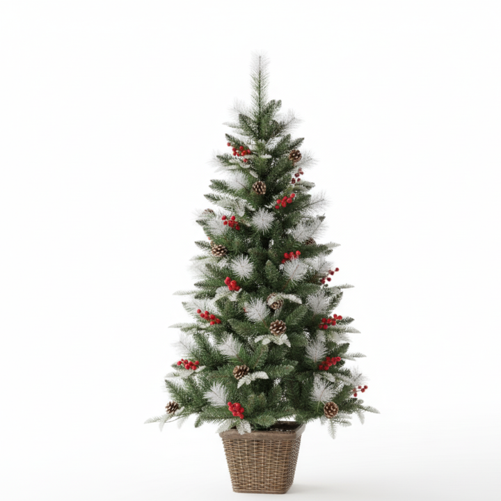 Create a magical holiday atmosphere with the NYRWANA Frosted Pine Cone & Berry Potted Artificial Christmas Tree, designed to bring the beauty of winter indoors. Standing 155 cm tall, this snow-frosted tree features realistic pine needles, pine cones, and red berries that capture the natural charm of a snowy forest.