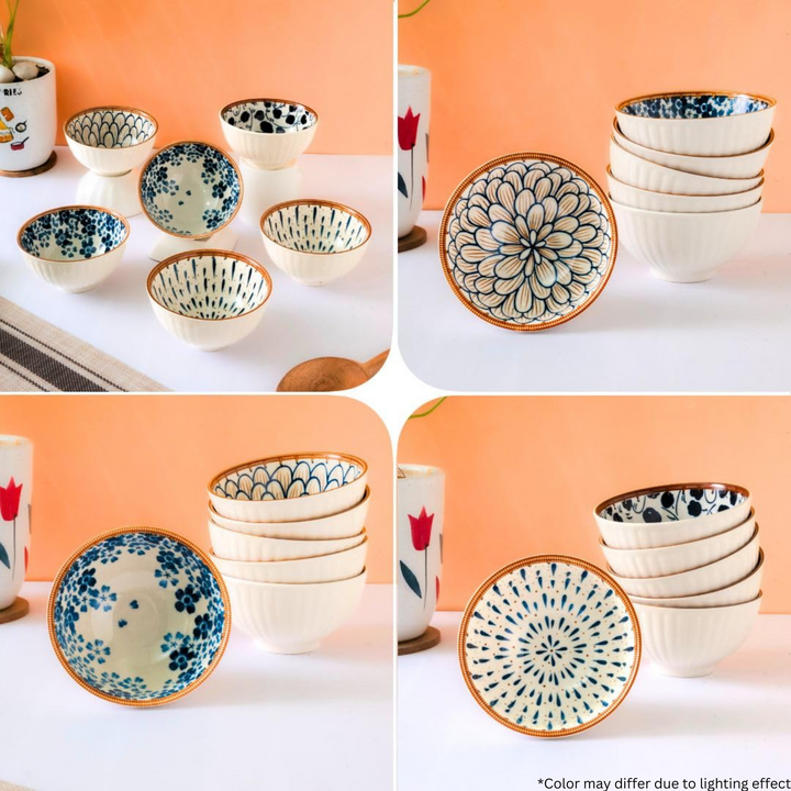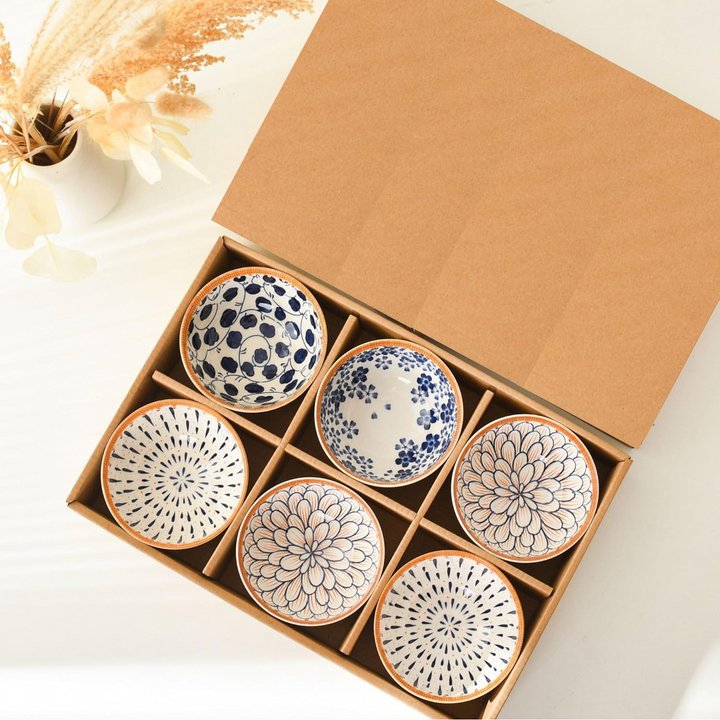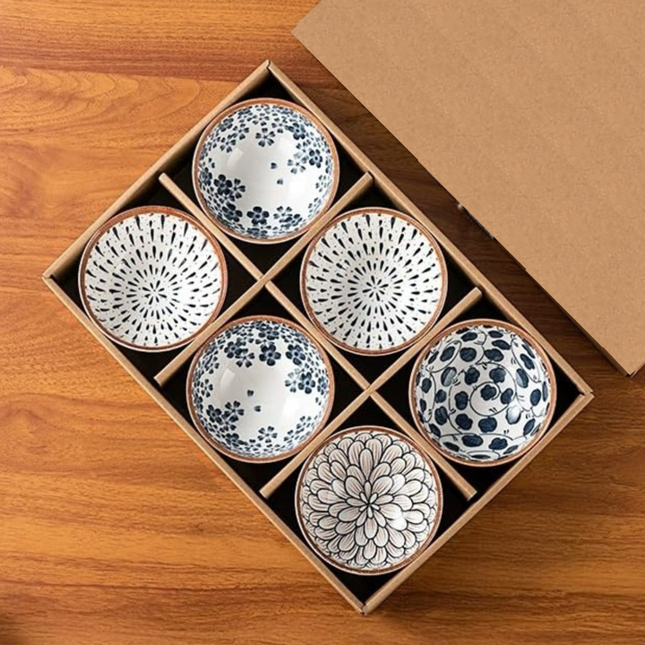 - Package Includes: Set of 6 beautifully crafted ceramic bowls packed in a premium gift box, each featuring unique blue and white Japanese-inspired patterns.