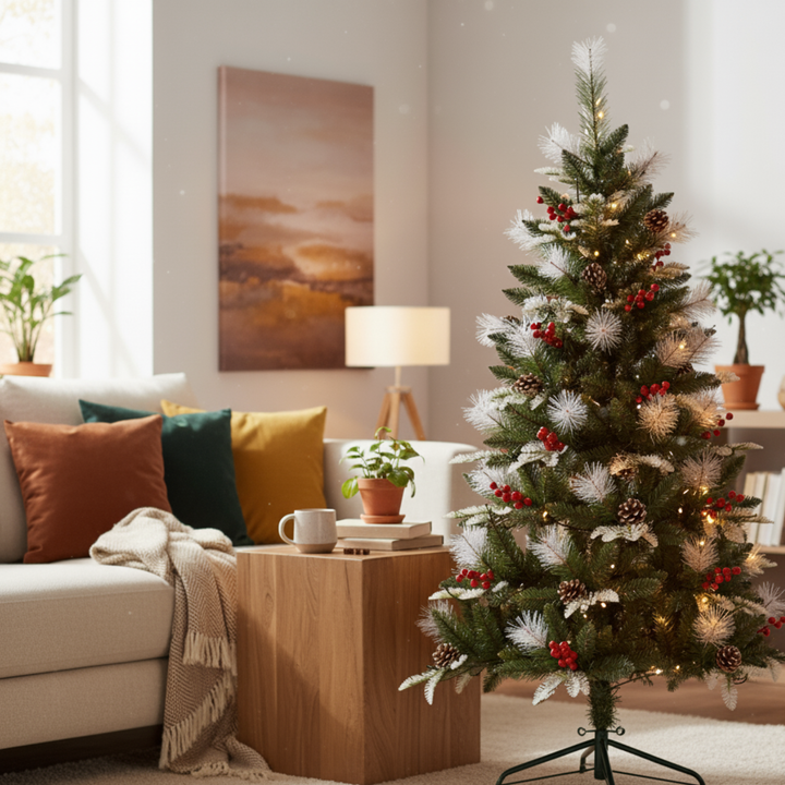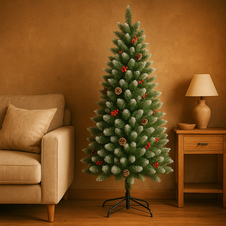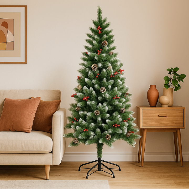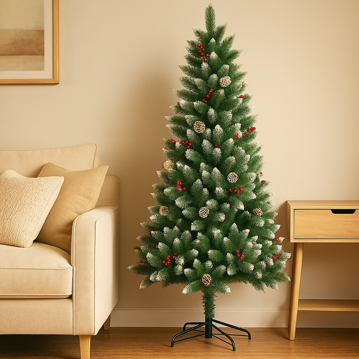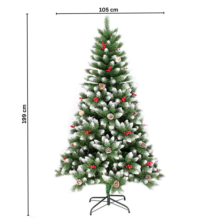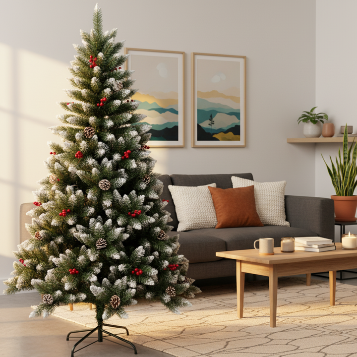 Celebrate the spirit of Christmas in style with the NYRWANA Premium Snow Flocked Artificial Christmas Tree — a perfect blend of elegance, durability, and festive charm. Designed with realistic pine cones and red berries, this tree captures the beauty of a snowy pine forest right in your home.